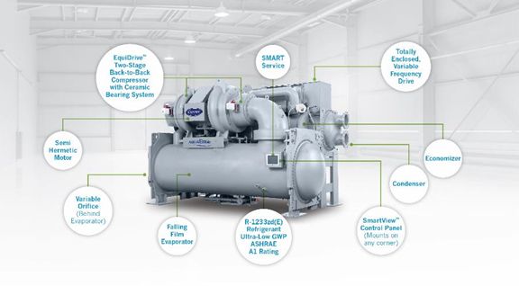 The Carrier® AquaEdge® 19DV was designed to minimize environmental impact while also addressing varying heating and cooling needs. If has a number of innovative features that set it apart from other water-cooled chillers available today.